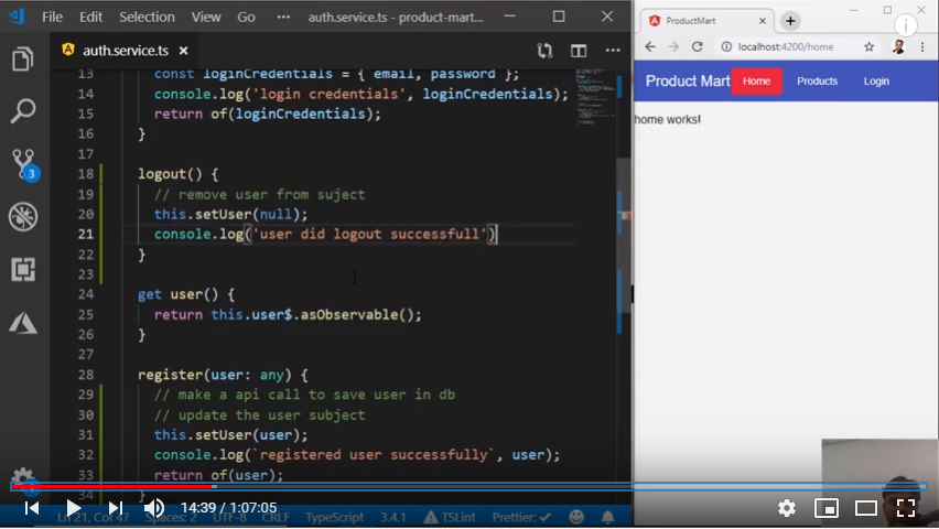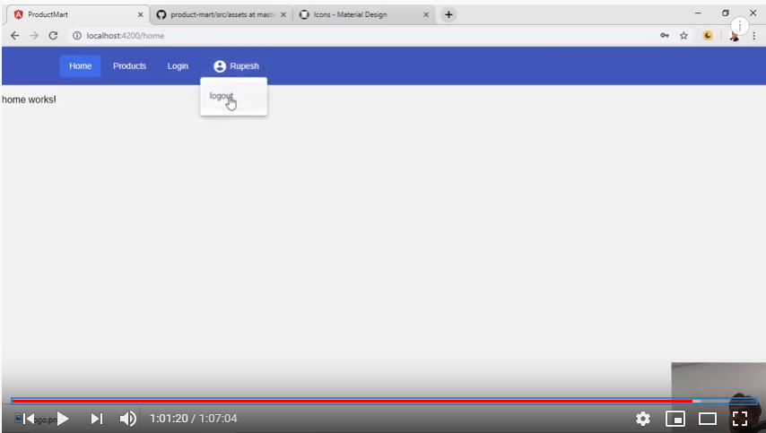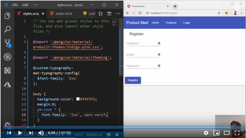 Let’s begin this demo session 0009-18- Demo: Adding Registration and Logout feature with change in some look and feel of our user registration page, by importing existing angular material themes. Also will create separate User.ts file and add new features to it like repeat password, logout feature etc, to make it more realistic.
