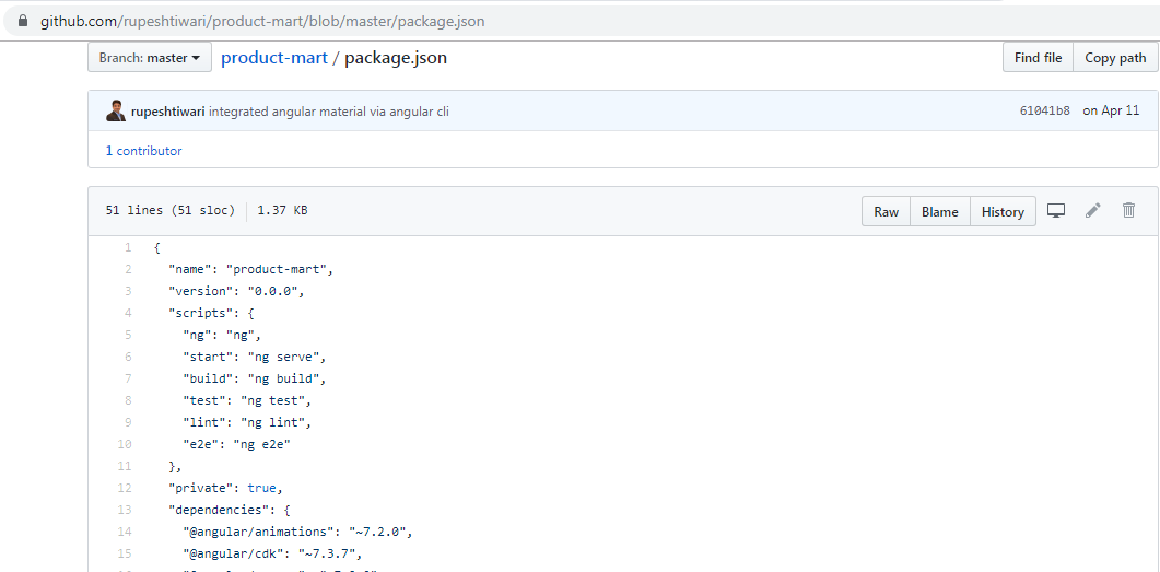 Next in order to put code inside JSON file, we will copy code which is already written in our GutHub repository https://github.com/rupeshtiwari/product-mart/blob/master/package.json and paste it inside our newly created JSON file. Our complete code is checked-in in our GitHub repository; one can take code snippets from there and utilize them in their project.