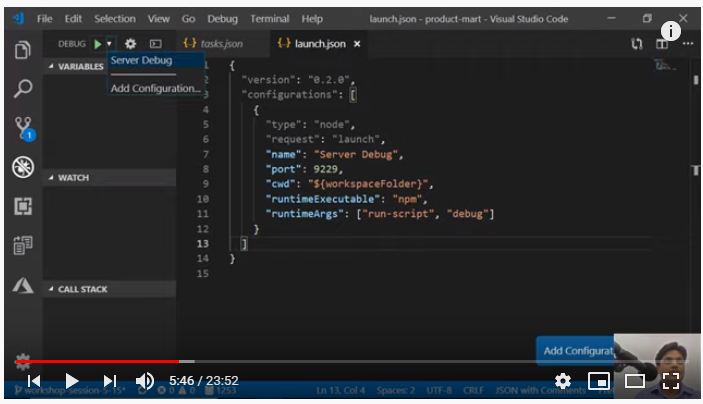 First we will see how to enable our code base for server side debugging. For this in the VSCode, we have .vscode folder where we have task.json file which will define how task works. Similarly, we will create launch.json file for our debugging purpose. Here we will define all properties related to server which will help us in debugging. After adding all required properties, we can see our “Server Debug” configuration is added in Debugger tool on left top corner.