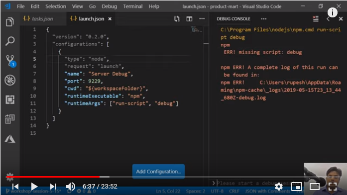 In above snapshot, it is showing error because in our package json debug script is missing. So now we will create a debug script in VSCode to stop the server process.