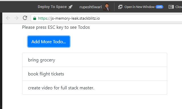 In above code also you notice when click on Add More Todo button we are replacing the container HTM with Add Todo Form without even properly destroying the old todo form. Therefore old todo form is still having click event handler which is connected with window object in JavaScript world. Hence Garbage collector can not clean up it and we start creating a memory allocation which never going to be clean up. The more todo we add the more memory allocations we create and our website will become sluggish and slow. Hence we created a memory leaking website.