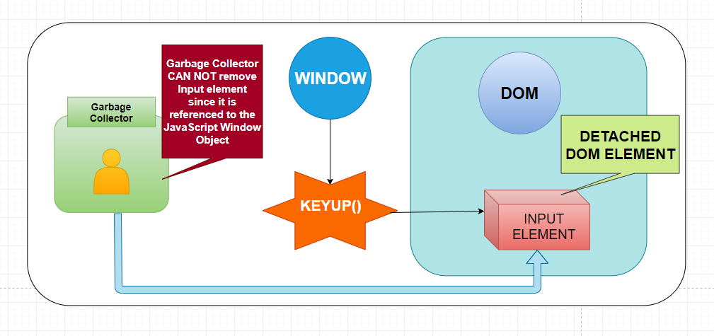 In the above code every time we select escape button we are adding Add More Todo Button into the DOM and we not removing the event handlers from the previous DOM. Therefore, the old DOM is not getting cleared or claimed by Garbage collector. Since the old DOM which got replaced has still event handlers connected to Window object, garbage collector will not remove it from memory. And therefore, every time we select escape button we create one Detached Element.