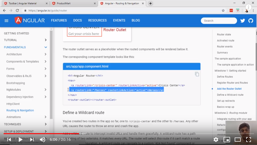 Next we will try to get some code for doing navigation using anchor. For this we have code snippets in angular material site under ‘Routing & Navigation’ heading.