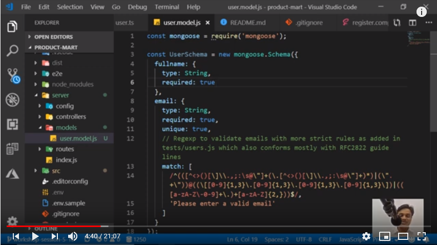 Next important thing to take care is while saving any entity in DB, we should create schema for it. For this we will create models folder and declare all schema related things inside it in user.model.js file. Also to validate email id we can put regular expression (available on net) in this file.
