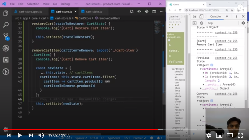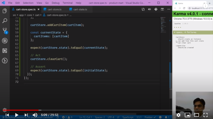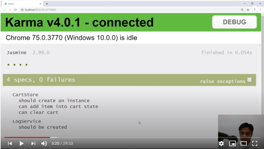 Next we will do another use case ‘Remove Cart Item’ from cart. In order to test it, first we need to create a state in the store and then proceed with other required coding part. All this is explained in detail in this video session, snapshot below with test case results: