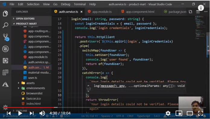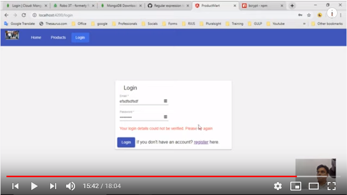 In this video session User Login In Angular With MongoDB | Demo | 0009-23 we will login into our product Mart app through MongoDB database and we will see how to validate the logging in user. Also we will learn how to show proper messages on successful and unsuccessful validation of user credentials. All this is explained with proper snapshots in below steps and code snippets are also available in our GitHub repository. Please visit https://github.com/rupeshtiwari/product-mart/tree/workshop-session-4-30 to check our code base.